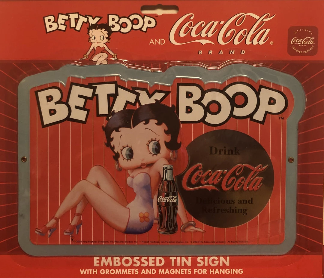 Betty Boop Coca Cola Embossed Tin Sign. Has Betty sitting next to a bottle of Coca Cola the Drink Delicious and Refreshing. Comes with grommets and magnets for hanging.