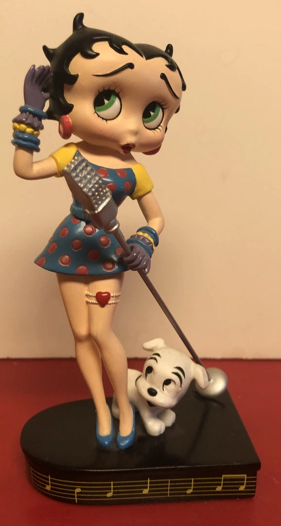 Betty Boop Danbury Mint Betty Sings the Blues. Betty is all dressed up in her cute little blue and red dot dress. At the mic ready to sing as Pudgy sits by watching 7″ Retired