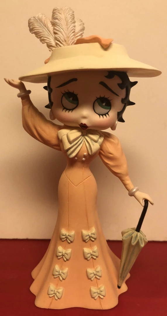 Betty Boop Danbury Mint Victorian Betty is part of the Boop Fashions Though The Ages Collection. Very hard to find. She is dressed in a peach and white colored Victorian dress and beautiful hat. She has a umbrella in her left had and her right hand is in the air. Very nice piece. 7 1/2″ Retired