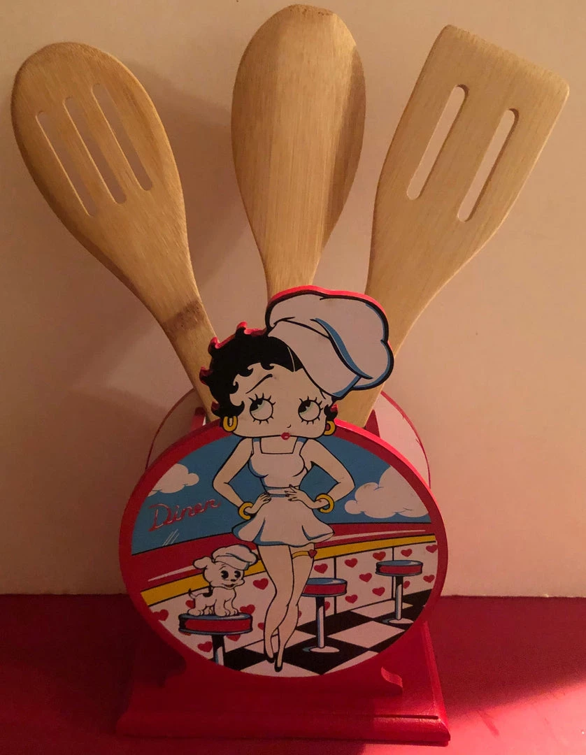 Betty Boop Diner Utensil Holder With Utensils Wooden Utensil Holder Wooden Utensils (3) Wrapped in Plastic Comes in brown box Retired 2006 8″ x 6″