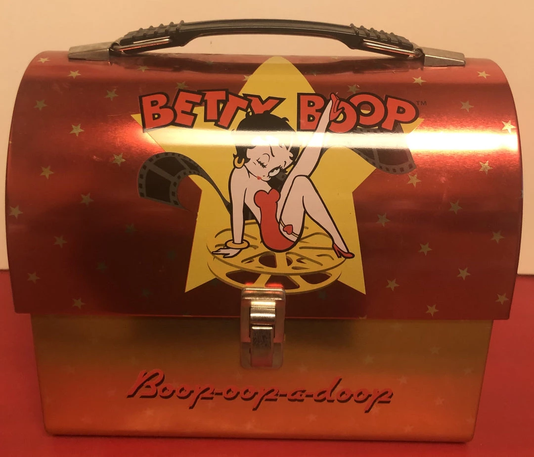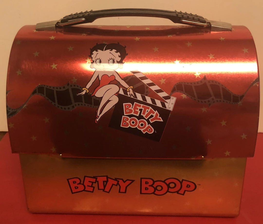 Betty Boop Dome Lunch Box Tin Box. Front side has Betty doing the kick in a yellow star, back has Betty in the sitting pose. Both front and back have Betty Boop on it. Front has Boop-oop-a-doop. Has old fashion lunch box closure and handle.