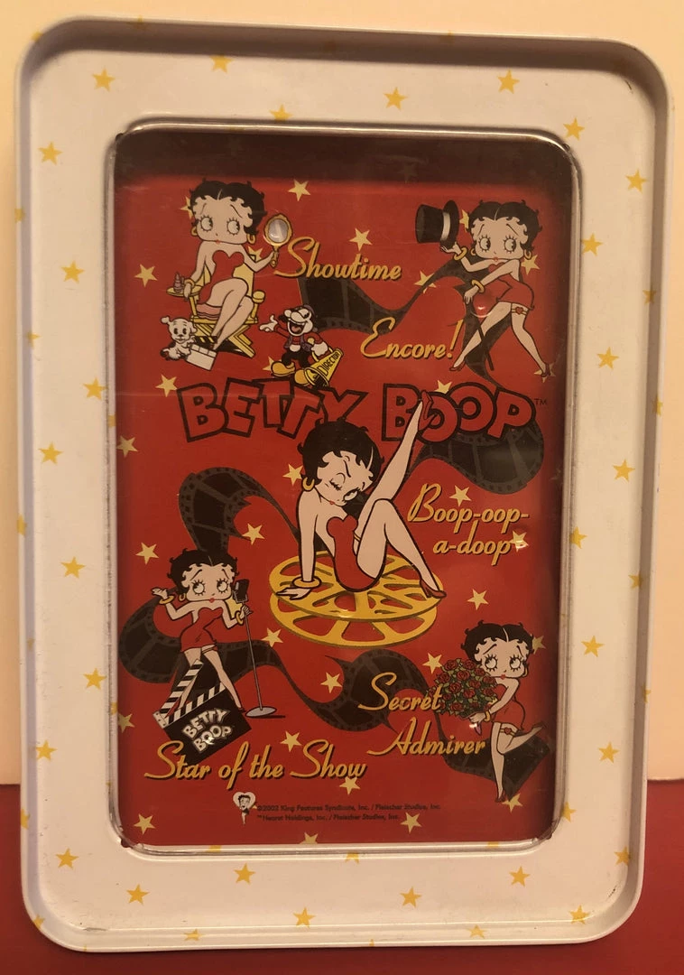 Betty Boop Film Strip Tin Ball Game is a fun game to play. The are 6 metal balls that you can roll around and try to get them in the 6 little holes, a game a skill. 7×5