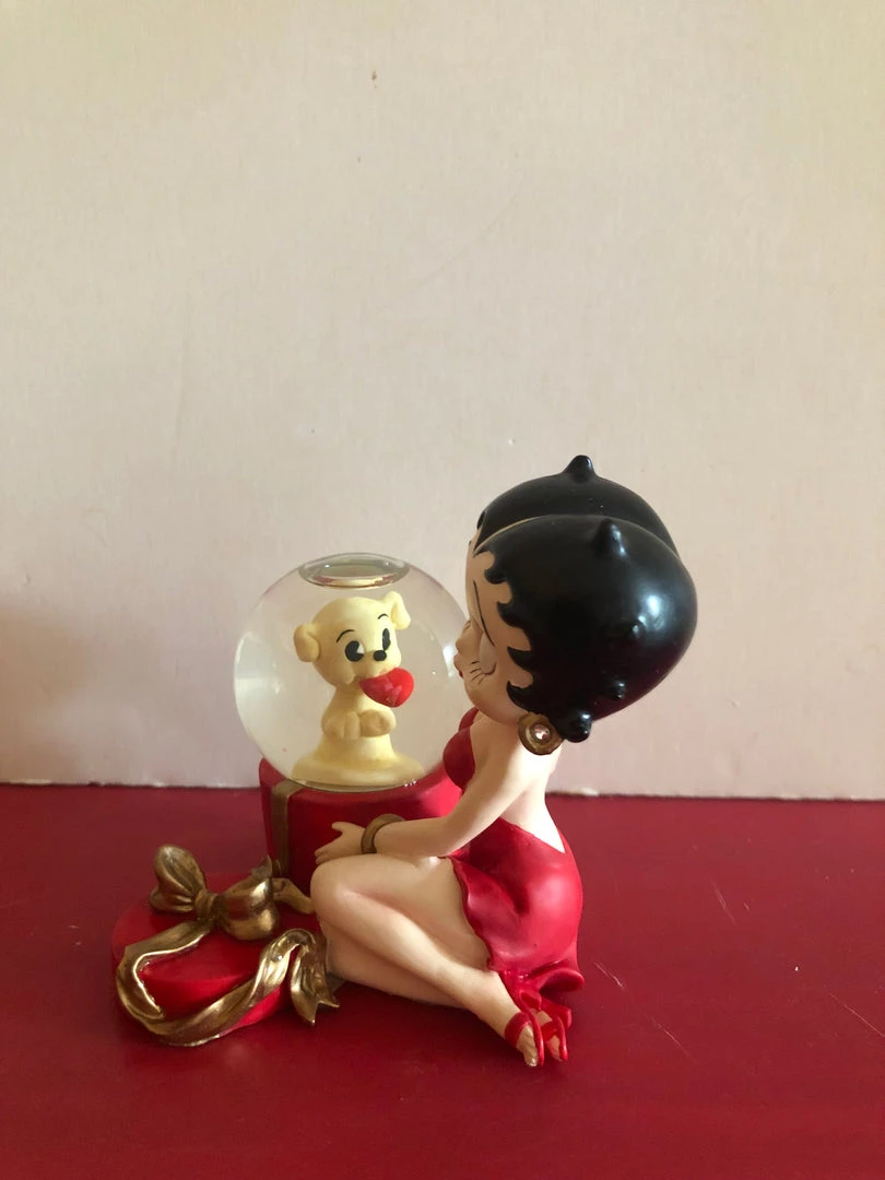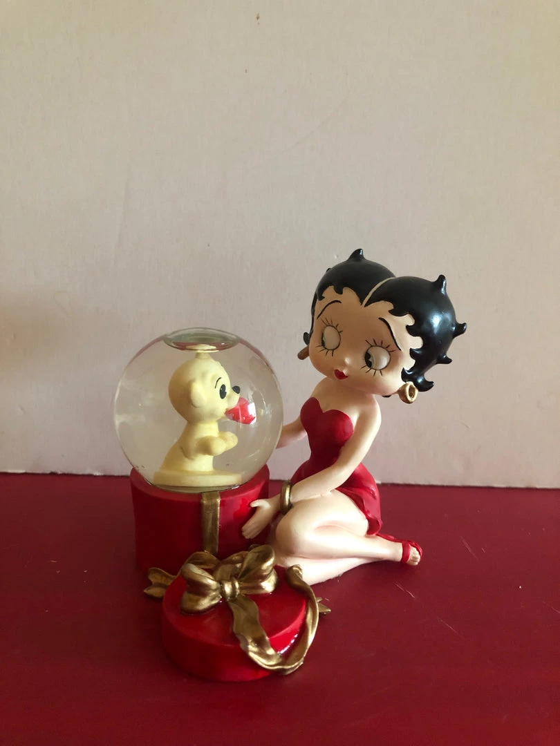 Betty Boop & Pudgy Gift Box Waterglobe has Betty opening a gift box to find Pudgy inside a waterglobe holding a red heart in his mouth. Very cute. Retired 1999 Hard to find piece 4″