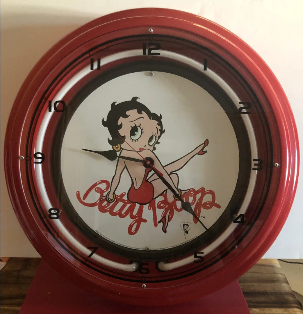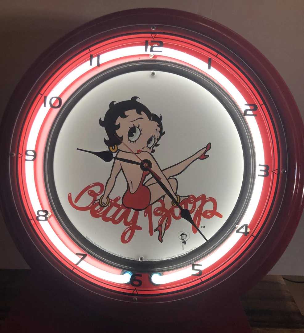 Betty Boop Red Metal Neon Wall Clock. This beautiful red metal neon clock has Betty doing the kick, sitting on her name. It is a large 19″ clock. Great for a game room or any room or office and is beautiful lighted or not. Runs on both 1 AA battery and electrical plug in with on and off switch.