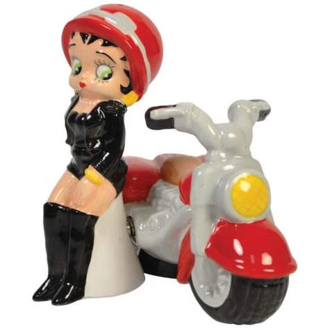 Betty Boop Salt and Pepper Shakers Betty standing in a vintage biker outfit next to a vintage motorcycle. Retired 2011