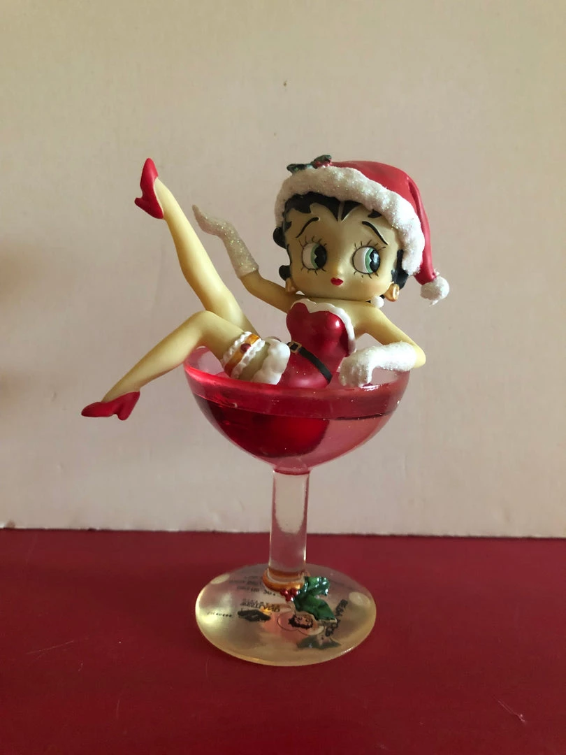 Betty Boop Santa Betty Wine Glass has Betty sitting in a wine glass. This very cute and very hard to find figurine has her all dressed up in her santa suit with a Santa hat, she is doing the kick. 5 1/2″