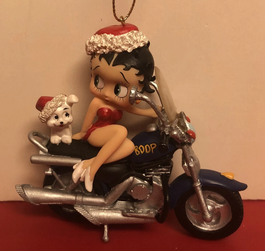 Betty Boop Biker Ornament 3×3″ Ceramic Santa Betty with Pudgy sitting on top of a motorcycle with her legs crossed. Blue motorcycle with Boop on the tank. Comes boxed.
