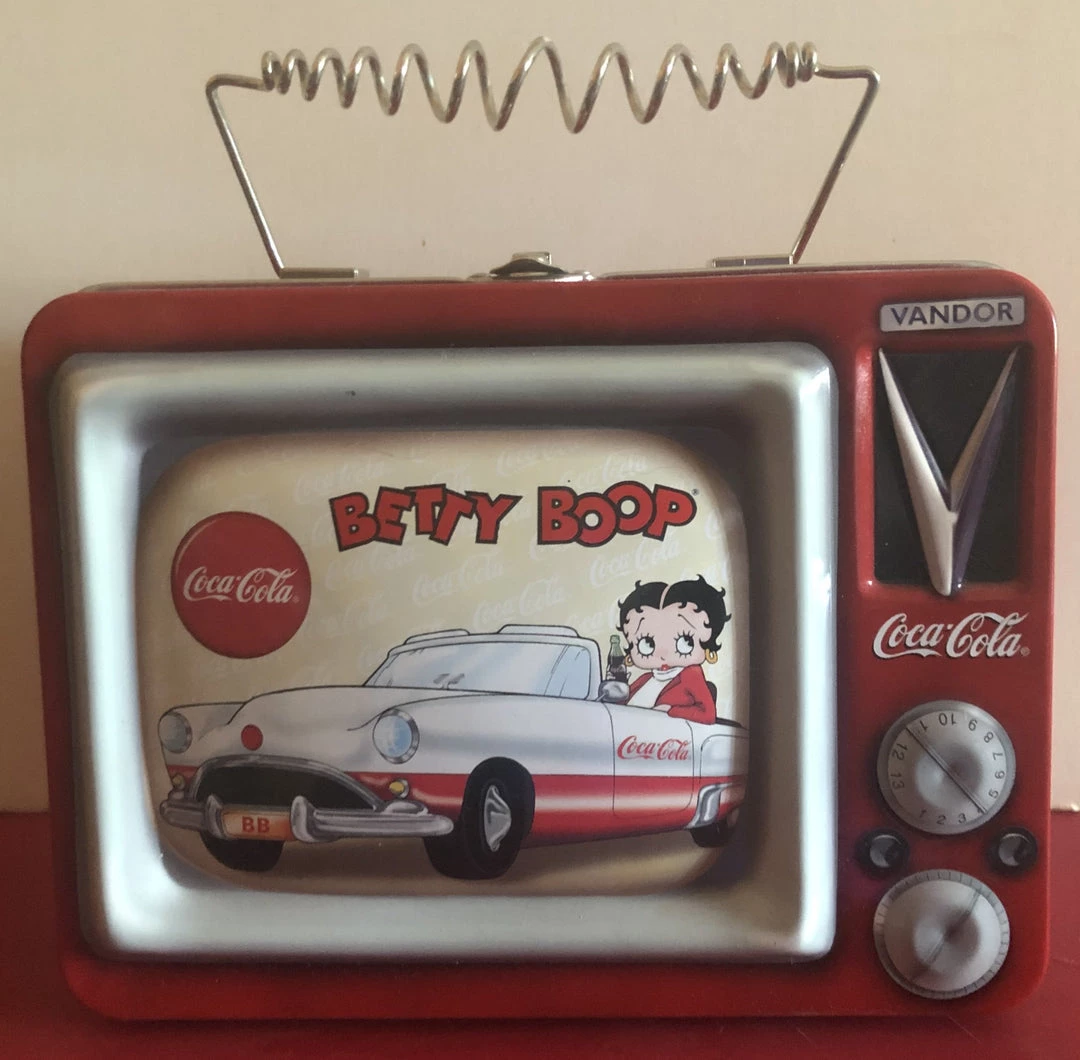 Betty Boop Coca Cola 55 Oldsmobile Tin Tote TV Style. This very hard to find tin tote is shaped like a old fashion television. Has Betty riding in a 55 Oldsmobile in a white turtle neck and white sweater holding a Coca Cola. Embossed to look like a TV with knobs and a antenna. Old fashion lunchbox clasp. Retired in 2000. Considered highly collectable.