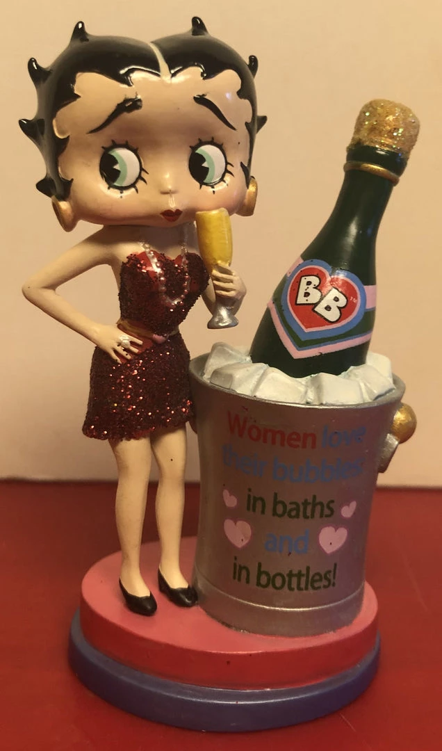 Betty Boop Danbury Mint Women Love There Bubbles Figurine has Betty dressed in a shimmering red dress with a glass of champagne in her hand. A ice bucket with a bottle sit beside her with Womer love their bubble in baths and in bottles! Part of the “It’s a girl thing collection.” Retired 2012 4″ Hard to find.