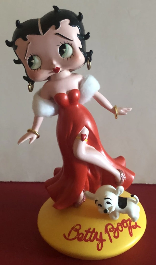 Betty Boop Red Dress Bobble Head and body and Pudgy has a spring too. She is dressed in red white a white fur wrap. Dancing on a yellow base. Her head bobble’s and her body bobbles too. 7 1/2″ Retired in 2003 Comes in white box. Hard to find