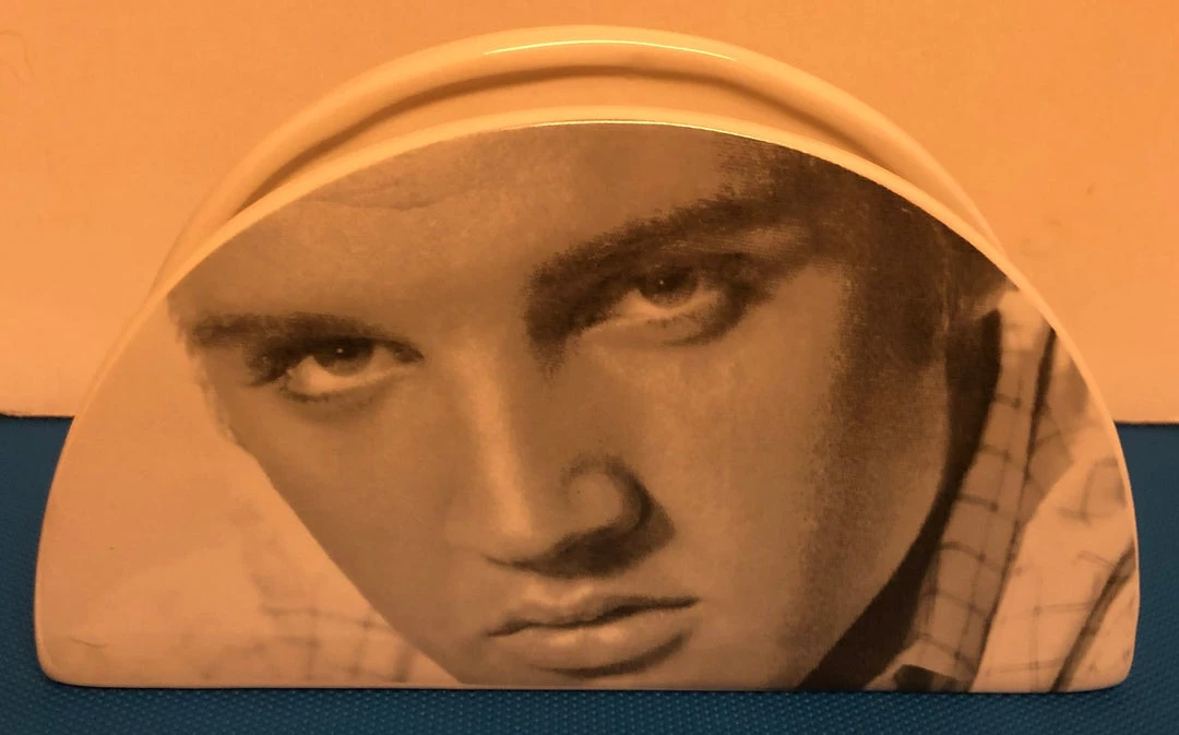 Elvis Napkin/Letter Holder is a black and white image of Elvis in his younger years.Β 5.5″