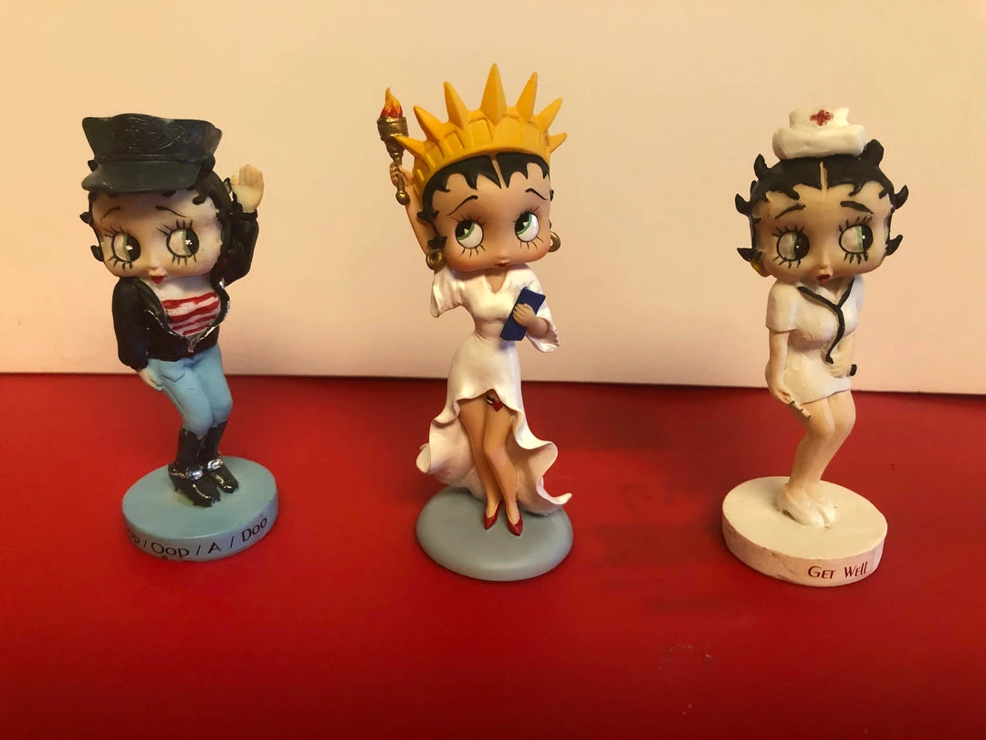 This set contains 1 Biker Betty figurine 3 1/2″ , 1 Lady Liberty Betty figurine 4″ and 1 Nurse Betty 3 1/2″. All in a box.