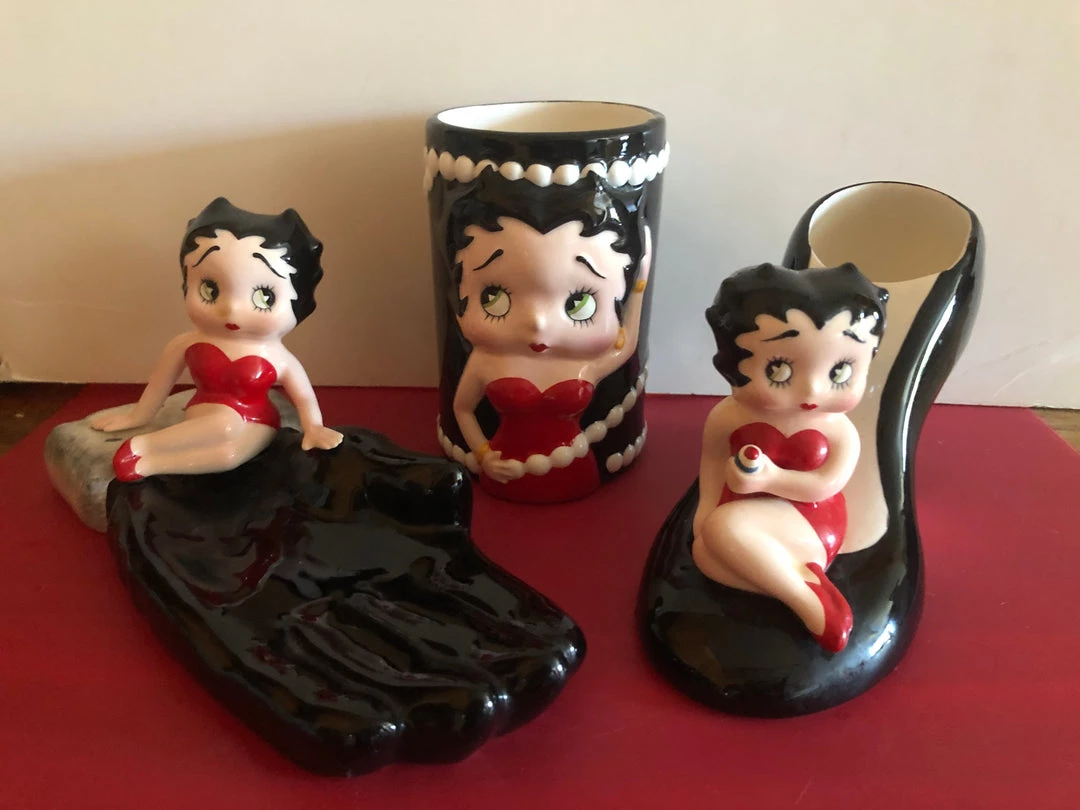 Betty Boop 3 piece bathroom set comes with a Soap Dish with Betty sitting on a glove, a cup with Betty Face and bust holding pearls and a toothbrush holder with Betty Sitting on a shoe. (Retired Item)