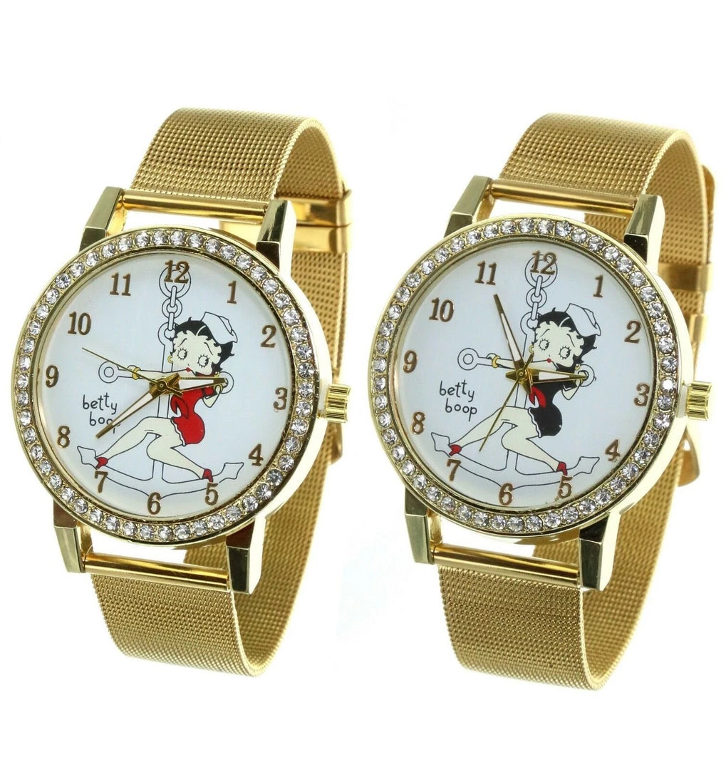 Betty is Dressed in either Red or Black standing on a boat anchor. Betty Boop is on the face. Gold Mesh Band. Simulated crystals around the face of the watch. Very Cute!