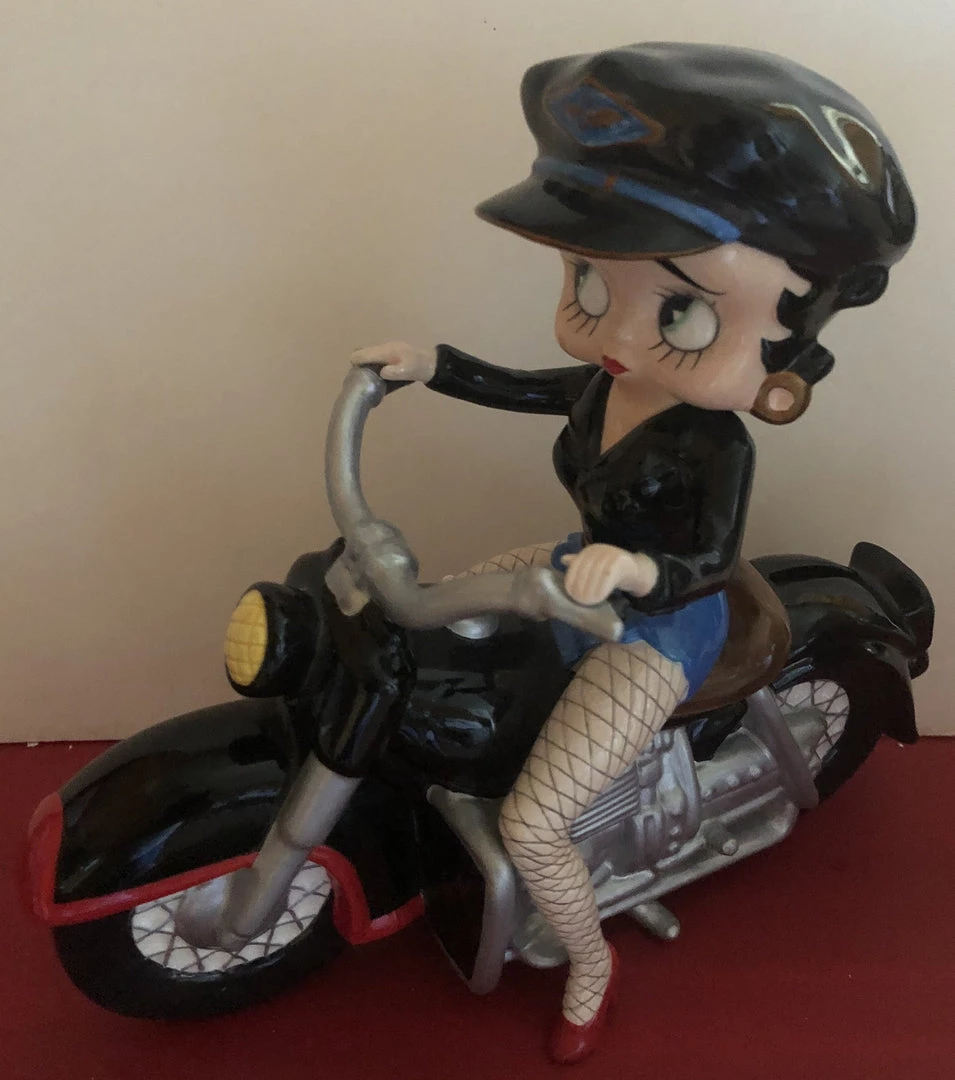 Ceramic Biker Bank. Has Betty sitting on her motorcycle in Biker style. Fishnets and heels. Slot for coins and bills in the back fender. Retired in 2004 9″ x 8″