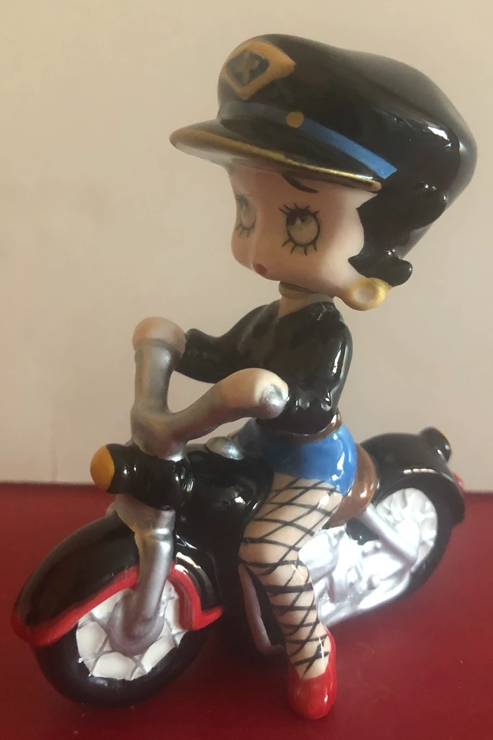 Betty Boop Biker Betty Bobblehead Figurine. Betty is all dressed up and ready to ride her motorcycle in her black leathers, black cap and red shoes.