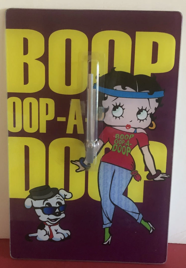 Betty Boop Boop Doop-A Doop Glass Clock has Betty Dressed in a Red Shirt and Blue Jeans with Pudgy in his cool sunglasses. 15″ x 10 1/2″ Runs on Batteries Not included