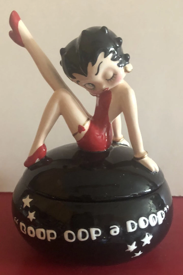 Boop Oop a Doop Trinket Box has Betty doing the kick and winking on top of a black round trinket box. Boop Oop A Doop is on the front of the trinket box.