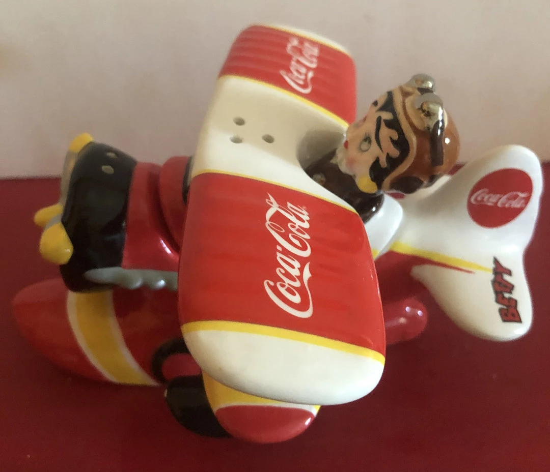 Betty Boop Coca Cola Biplane Salt and Pepper Set- This set has Betty Flying the biplane ad the other half is the landing strip. Branded with Coca Cola this hard to find piece is great for any collection.
