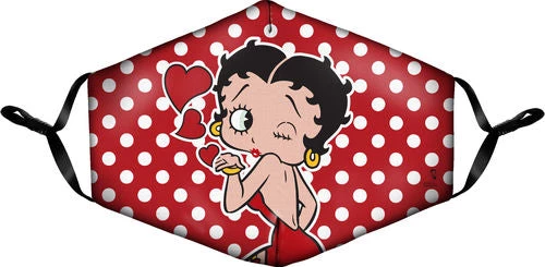 Betty Boop Face Mask has Betty winking and blowing a kiss. Has adjustable ear straps and a pouch for putting in a extra filter (not included). Very easy to wear and breathe in.