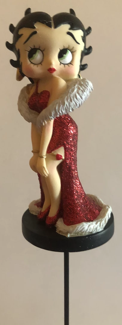 Betty Boop Garden Stake Figurine has betty in a beautiful red shimmering long dress with a white fur sculpted collar and dress trim. She is wearing red shoes. She has a strong 6 inch stake that screws into the base. Great for a planter or even a great Cake Topper.
