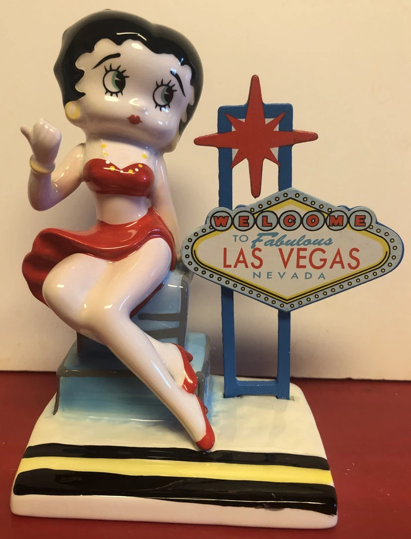 Betty Boop in Las Vegas Figurine This cute figurine has Betty sitting in a cute red outfit looking to hitch a ride to Vegas next to the famous Las Vegas Sign. This is a nice piece and a MGM special. 6″w x5″t Comes in white box.