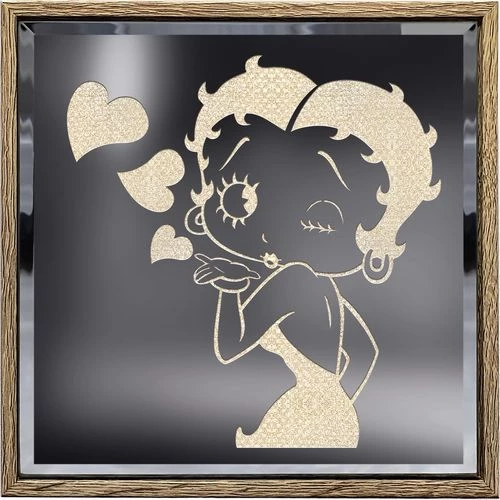 Wooden box with mirror front. Insider carved Betty blowing a kiss. Lights up. Switch in back. Take AAA batteries “Not Included” 6 1/2 x 6 1/2 x 1 3/4