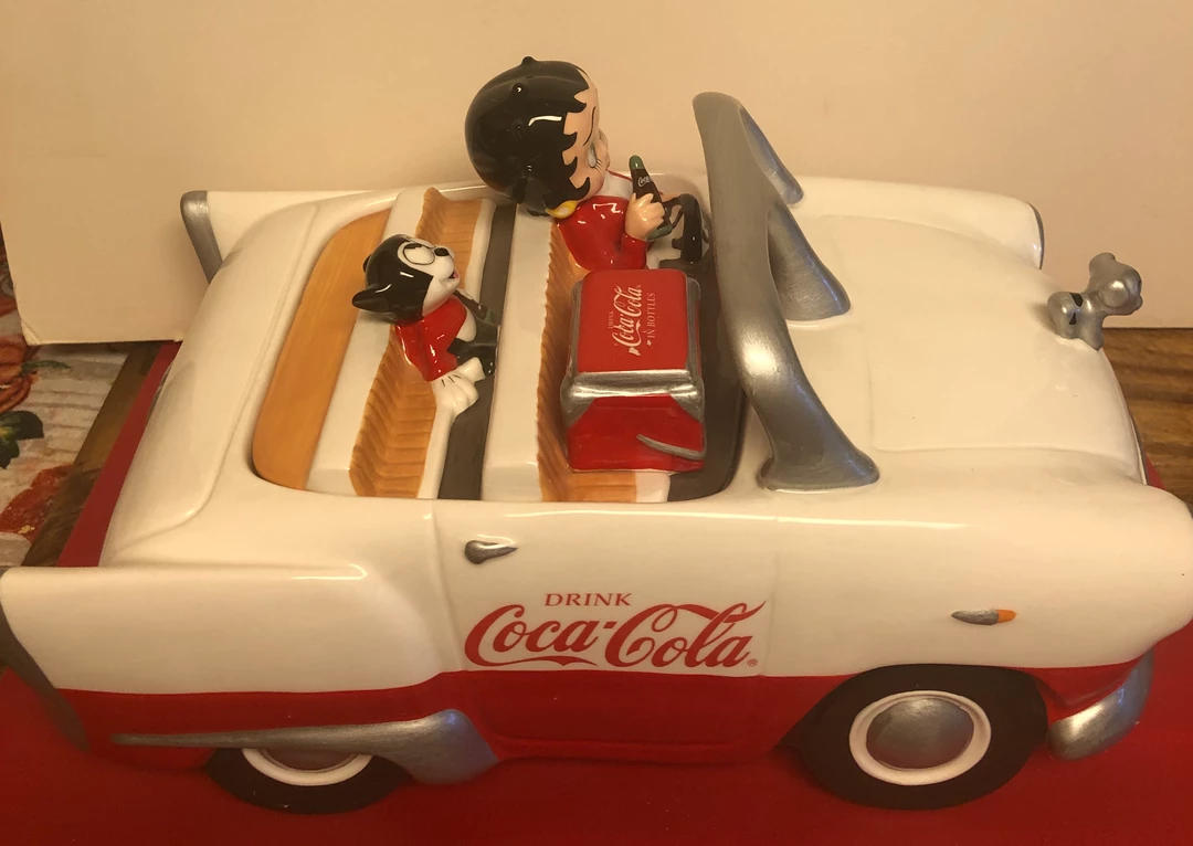 Betty Boop Limited Edition Coca Cola Car Cookie Jar Approz 14″x 8″x8″ This very rare cookie jar is number 2354 of 10,000. Number is on cookie jar and match’s the number provided. This extremely rare piece to find has Betty driving her Coca Cola car with Kinko in the backseat and pudgy is the hood ornament. She has a old fashion ice box in the front seat of the car Coca Cola is printed on both sides of the car. Top comes off for opening. This is a very special piece to find. Only 1 in stock.