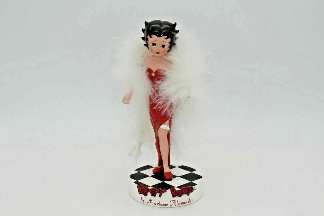 The Madame Alexander Classic figurine has Betty wearing her red dress withย a white feather boa.ย She is standing on a checkered base with her name under the figurine along with the maker Madame Alexander.ย Comes with Certificate of Authenticity. 7″