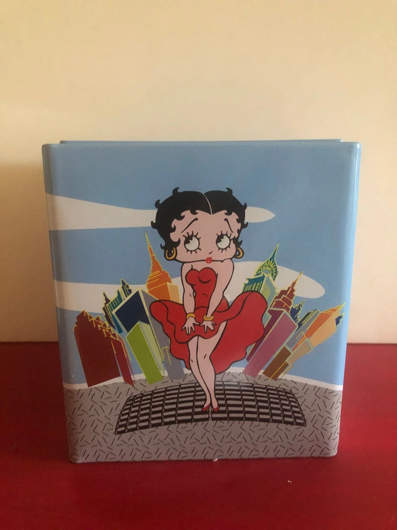 Betty Boop Marilyn Pose Tissue Holder has Betty standing on on a grate with the wind blowing her dress up. The city is behind her, the same view is on the side.