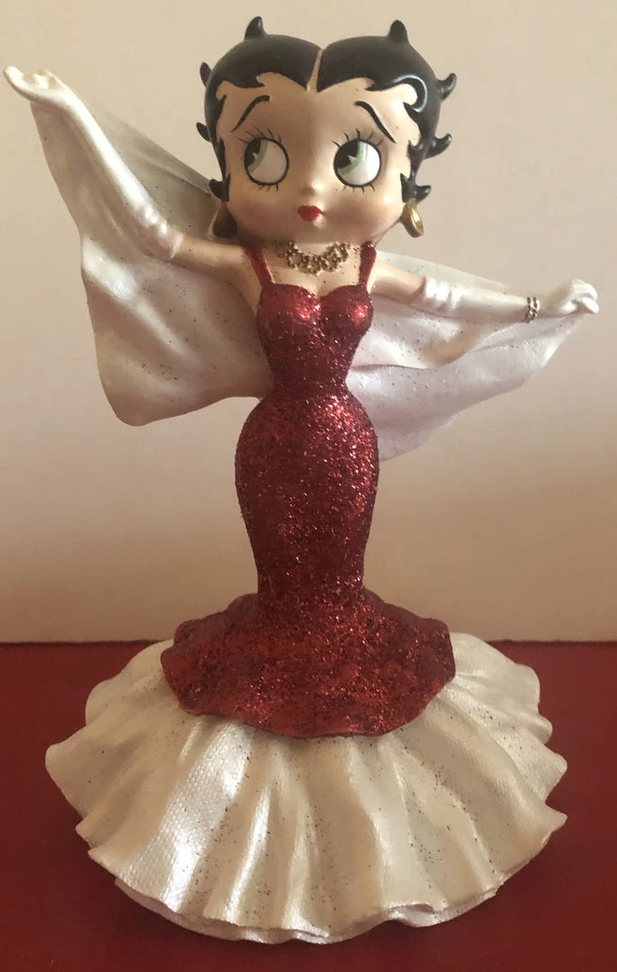 Betty Boop Mermaid Glitter Dress Figurine. Betty is dressed in this beautiful long red dress with a mermaid white ruffle bottom. She is wearing white gloves and has a white shawl she is putting over her shoulders in case it gets cold. This piece is very hard to find. 7 1/2inΒ Β Come’s in white box.