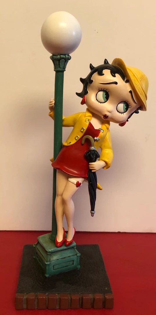 Betty Boop Singing in the Rain – Betty Dressed in Red with her Rain Jacket and Cap on, holding a umbrella and holding on to a lamp post. 8 1/2″