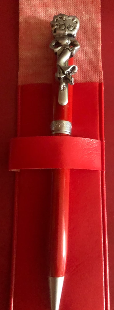 This beautiful Collectable Brass Ball Point Pen has a full Betty Boop on it. It also has a brass ring with the words Betty Boop. Retired 1997 Betty Boop Collectors Pen. Solid brass pen, compatible refill. Comes with its own protective case.