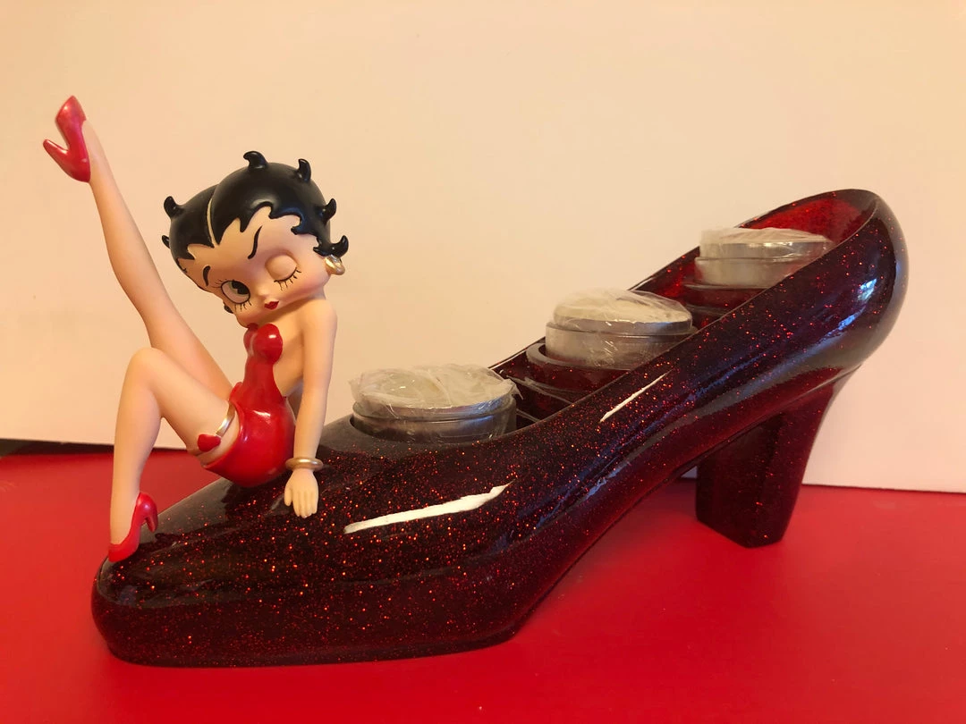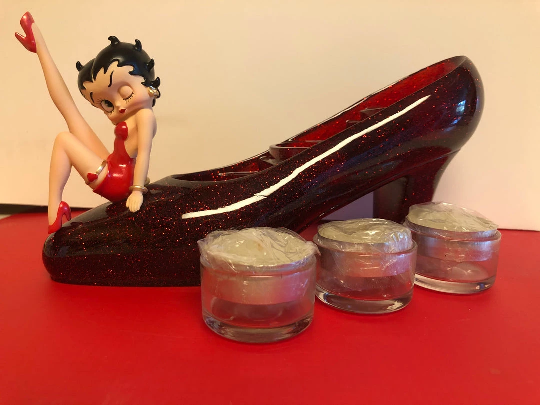 This beautiful votive holder is a Red Shoe. It hold 3 votives in it and has 3 glass holders, candles are included. Betty is sitting on the shoe doing the kick and giving a wink.