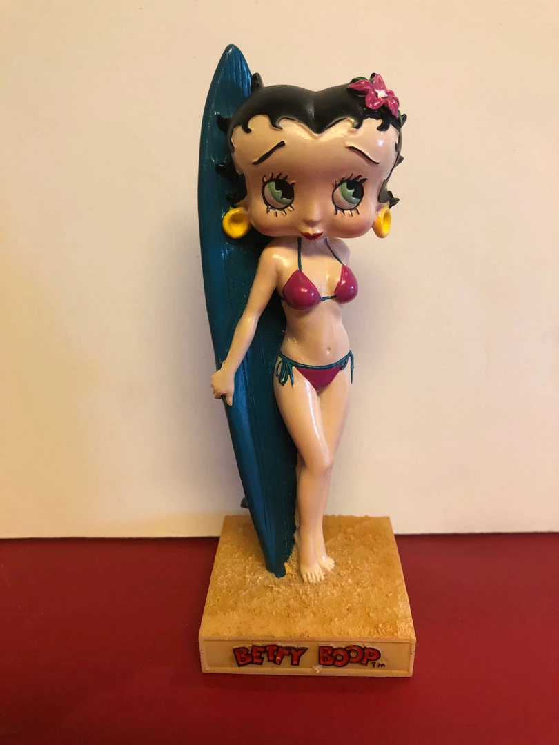 Betty Boop Surfer Girl is dressed in her cute red bikini and is standing on the beach with her surfboard ready to hit the waves. 5″ Comes in a clear box.