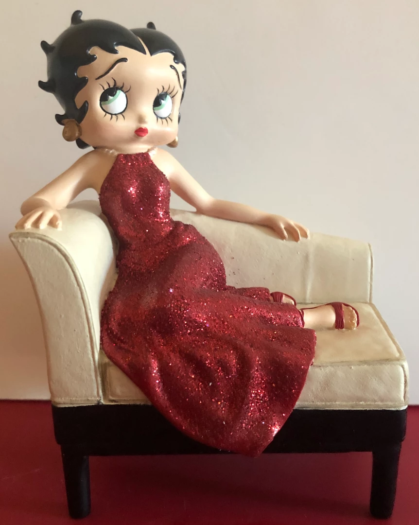 Betty Boop Sweet Day Dreams has Betty resting in a beautiful read gown on a antique couch. She is wearing read shoes. This piece is very hard to find. Retired 2002 7 x 5 1/2
