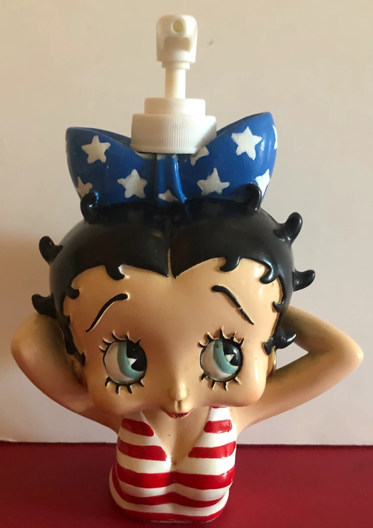 Betty Boop USA Soap Pump has Betty in a red and white stripped tank top and blue with white stars bow. Top twists off to add liquid hand soap or lotion.