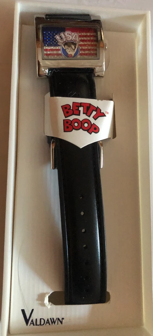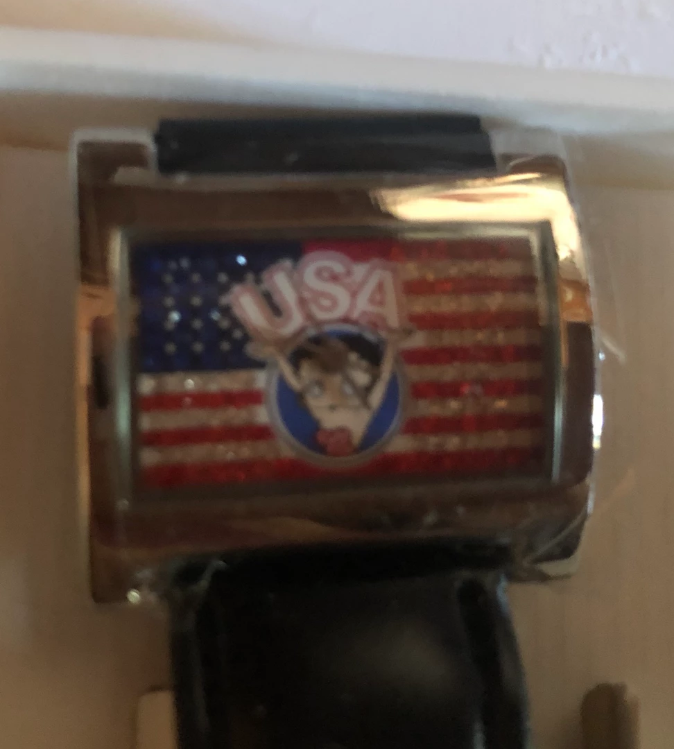 This Betty Boop USA Watch has Betty with her arms in the air and USA on the Face. The flag is made of rhinestones. Has a black leather band Come’s in a Hard case giftbox with Betty Blowing a kiss. Retired in 2001