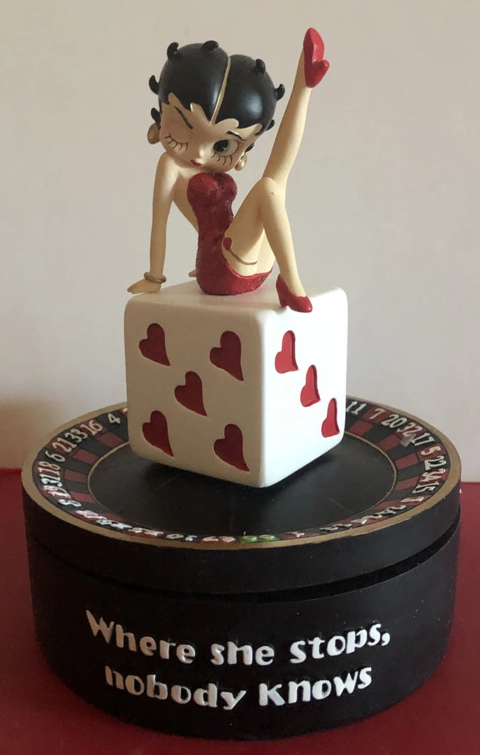 98Where She Stops Musical Figurine has Betty sitting on top of a dice and a roulette wheel. She is dressed in red doing the kick and a wink. Plays luck be a lady.