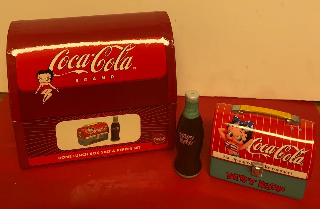 Cute lunch box holds the Salt 7 Pepper Shakers, a Coke Bottle and Lunch Box.