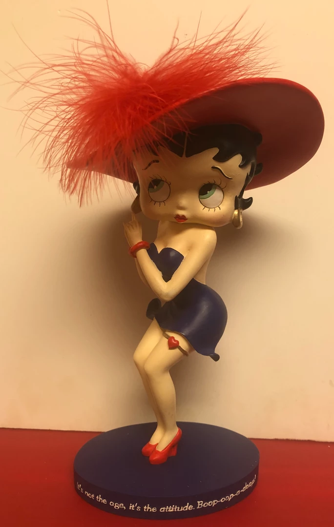 Betty Boop It’s Not The Age figurine has betty dressed in a short purple shiny dress with a red hat and red feathers. She is wearing red shoes and are garter with a heart on it. On her base is says IT’S NOT THE AGE, IT’S THE ATTITUDE. BOOP BOOP DE DOOP 9″ Large heavy figurine. Retired in 2004
