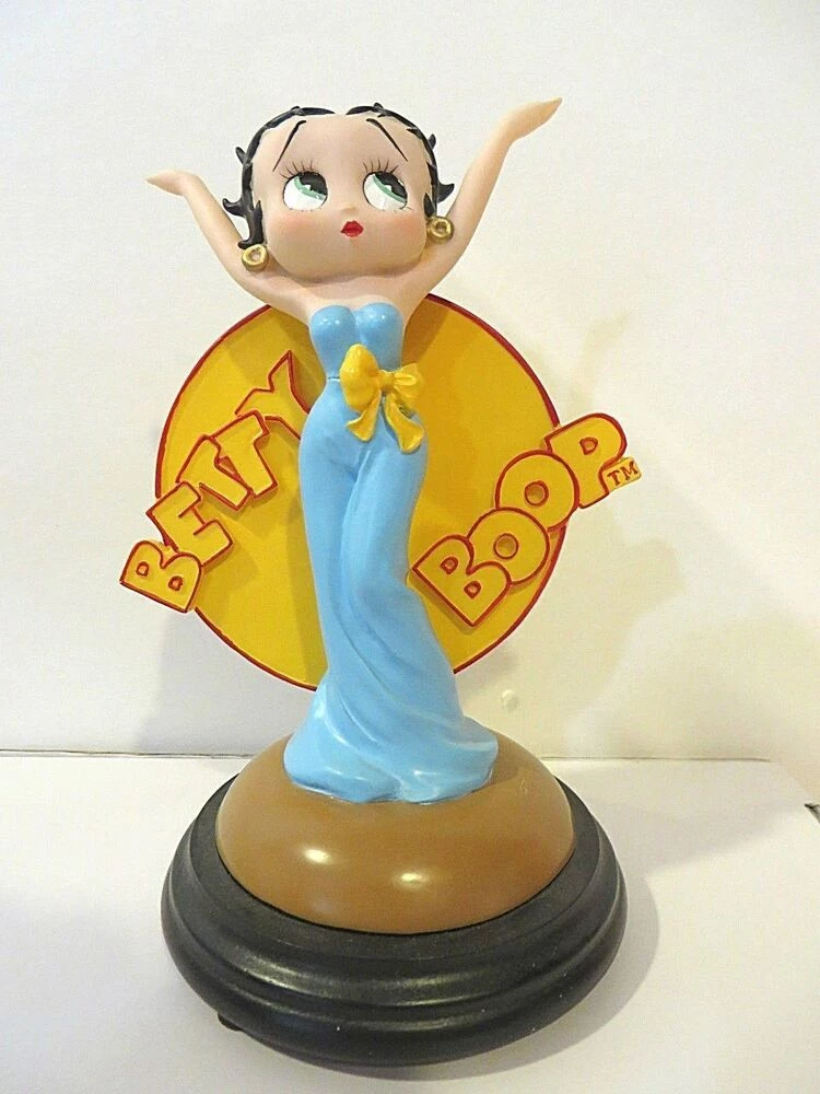 This cute figurine has betty dressed is a long blue gown with her hands in the air. Behind her is a yellow circle with her name. She is standing on a black stand. 6″