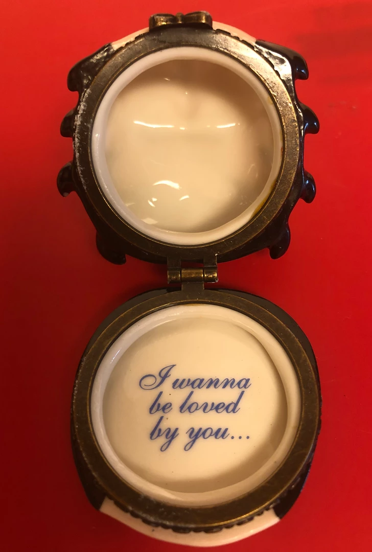 The cute Madame Alexander Fine Pocelain Hinged Face Box opens for find the words i wanna be loved by you.