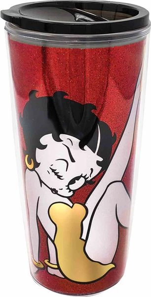 Betty Boop Red Glitter Mug. Slide sip top. Betty doing the kick in gold dress.