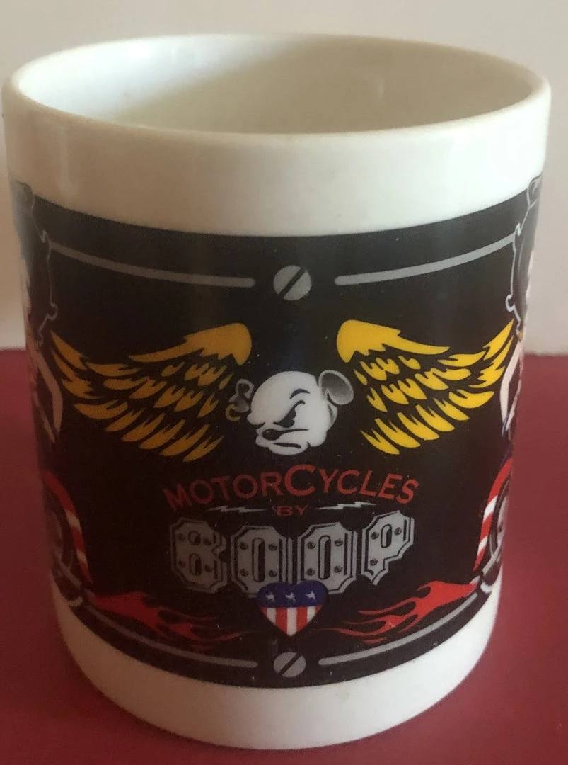 Betty Boop Biker Americana Mug has Betty on her Red, White and Blue Bike. She is also dressed Americana Style. Print on both sides with wings in the in the middle with motorcycles boop. Retired