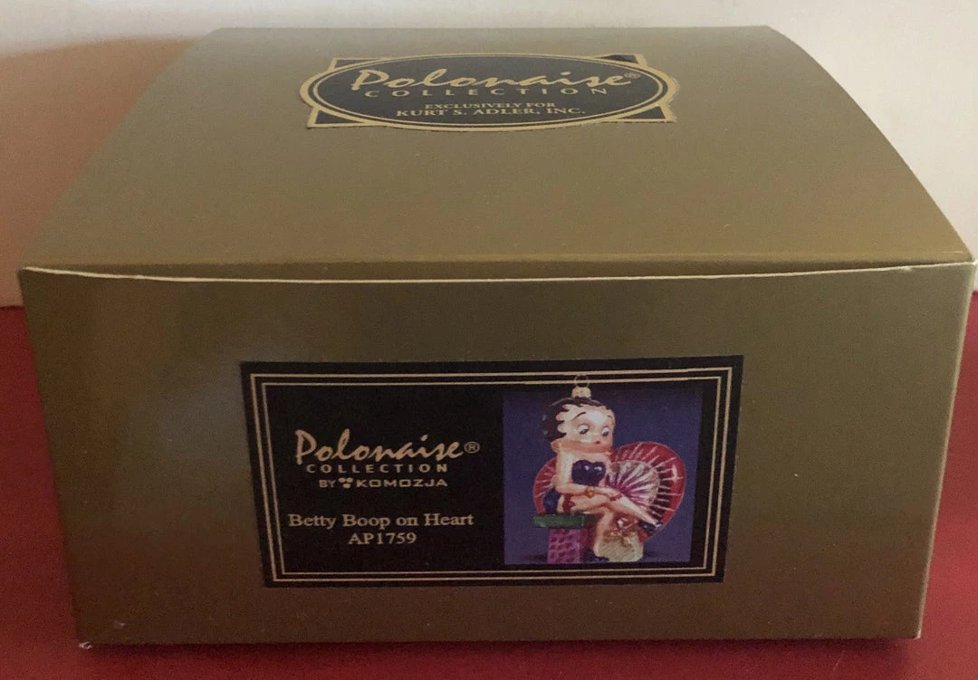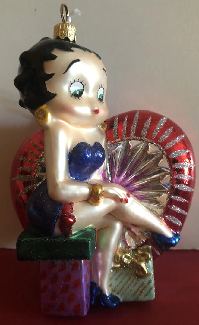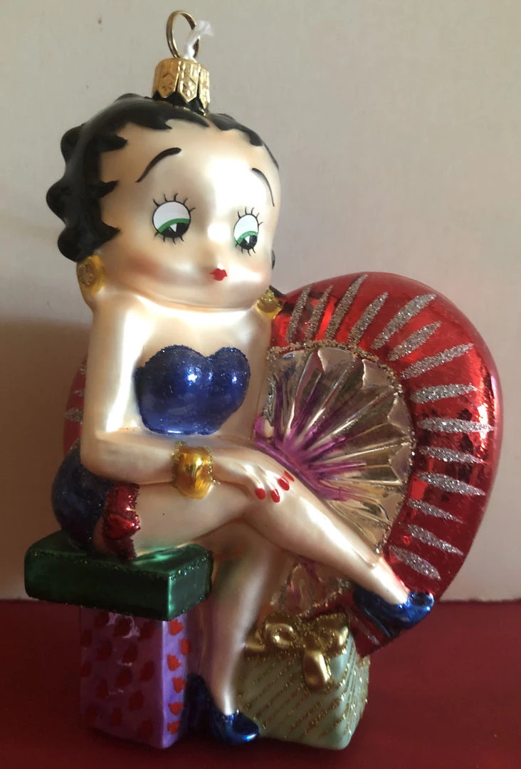 Polonaise Betty Boop on Heart Ornament. 6″ x 4″Ā This beautiful glass ornament has Betty sitting on a gift with a large heart behind herĀ She is dressed in blue.Ā This ornament comes with it’s original registration papers and in it’s originalĀ golden Polonaise box made by Komozja.Ā Made in Poland.Ā Ā Ā Ā Ā Ā Retired and very hard to find.Ā 2003