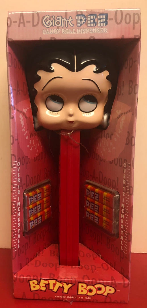 Betty Boop Giant Pez Dispenser holds 6 packages of pez candies.ย ย She stand a giant over 12″ tall.ย Red base to fill with candy and a large Betty head 4 1/2″.