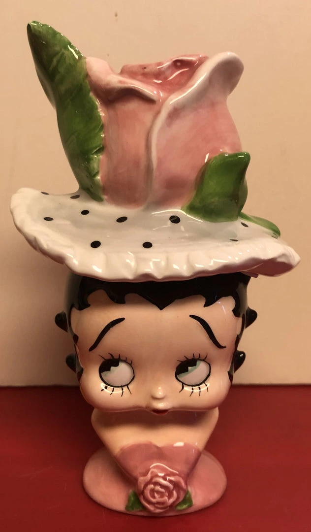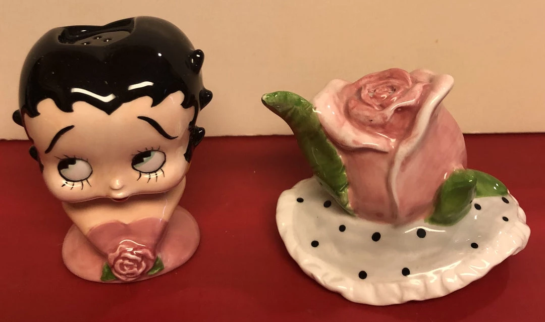 Betty Boop Hat Salt and Pepper Shaker Set. This beautiful set has the one shaker as the rose hat and one as Bettys face and bust. 5″ This is a gorgeous set. Could also be set like a figurine. Made from Vandor Retired in 2001