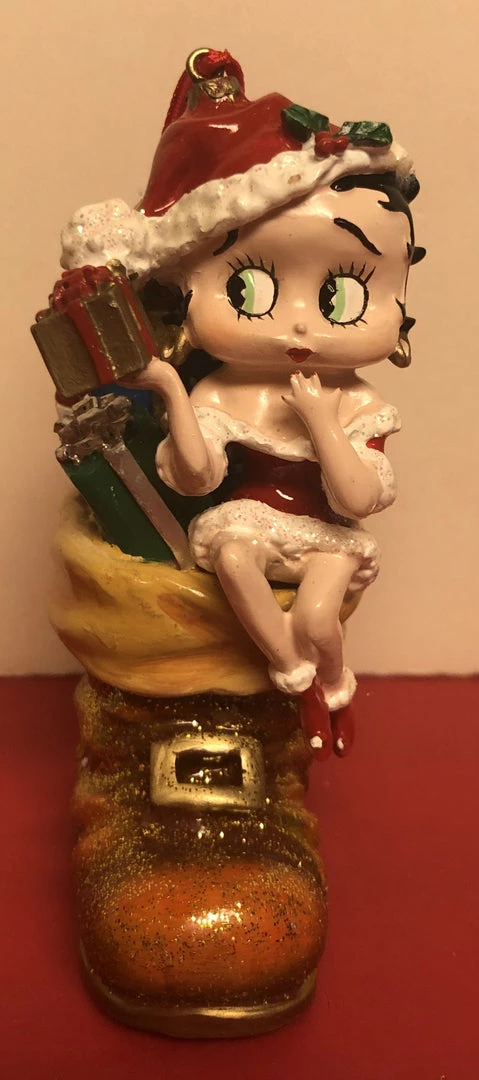 Betty Boop in a Santa Boot Ornament. 4″ Betty is Sitting in Santa’s boot filled with presents and dressed in a Santa Suit and Hat. She is holding a gift. Ceramic Piece in a box. Retired
