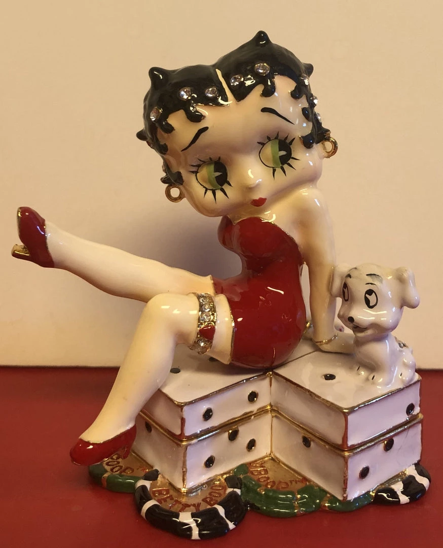 Betty Boop Kick on double dice porcelain box has Betty doing the kick. Pudgy is sitting next to her on the double dice with poker chips under the dice. Beautiful piece. The box opens up to put rings or other jewelry into.